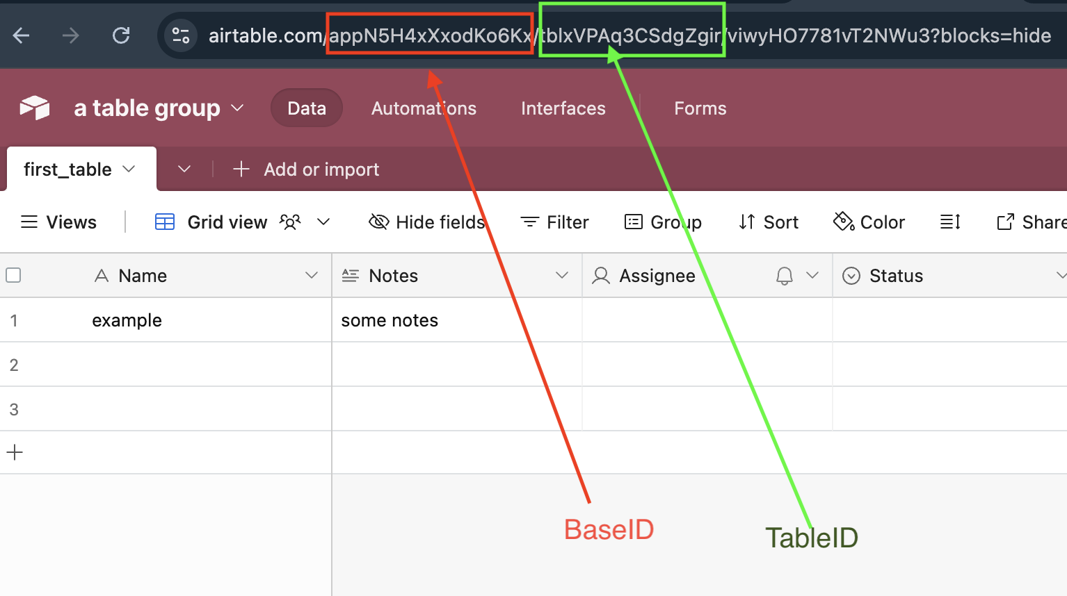 Get your base ID and table ID from your table's URL.
