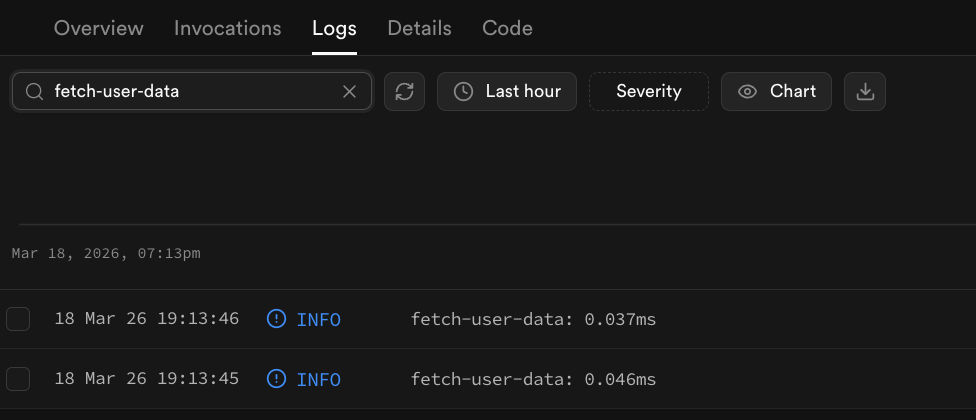 1console.time('fetch-user-data')2const userData = await fetchUserFromDatabase(id)3console.timeEnd('fetch-user-data')The time response will show up in the function's dashboard under the Log tab with the label you assigned it. You can use the label as a keyword to search for the timestamp.